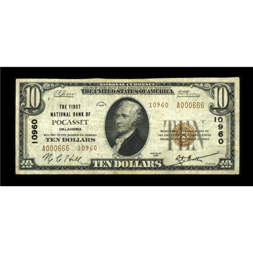 <B>Pocasset, OK</B></I> - $10 1929 Ty. 2 <B>The First NB</B></I> Ch. # 10960<BR>An extremely scarce note from the only bank to issue in this tiny Grady County location. Just four large and three small notes comprise the entire census from here, with no offerings of any kind since 1998 save for the considerably lower grade example we sold in our January sale. <B>Fine-Very Fine,</B></I> with a well disguised repaired split on the right side.<BR><I>From The Rolling Plains Collection</B></I><BR><BR><b>Shipping:</b> Coins & Currency (<a target="_blank" href="http://www.heritageauctions.com/common/shipping.php">view shipping information</a>)
