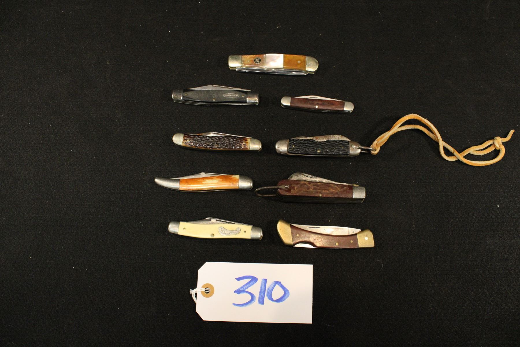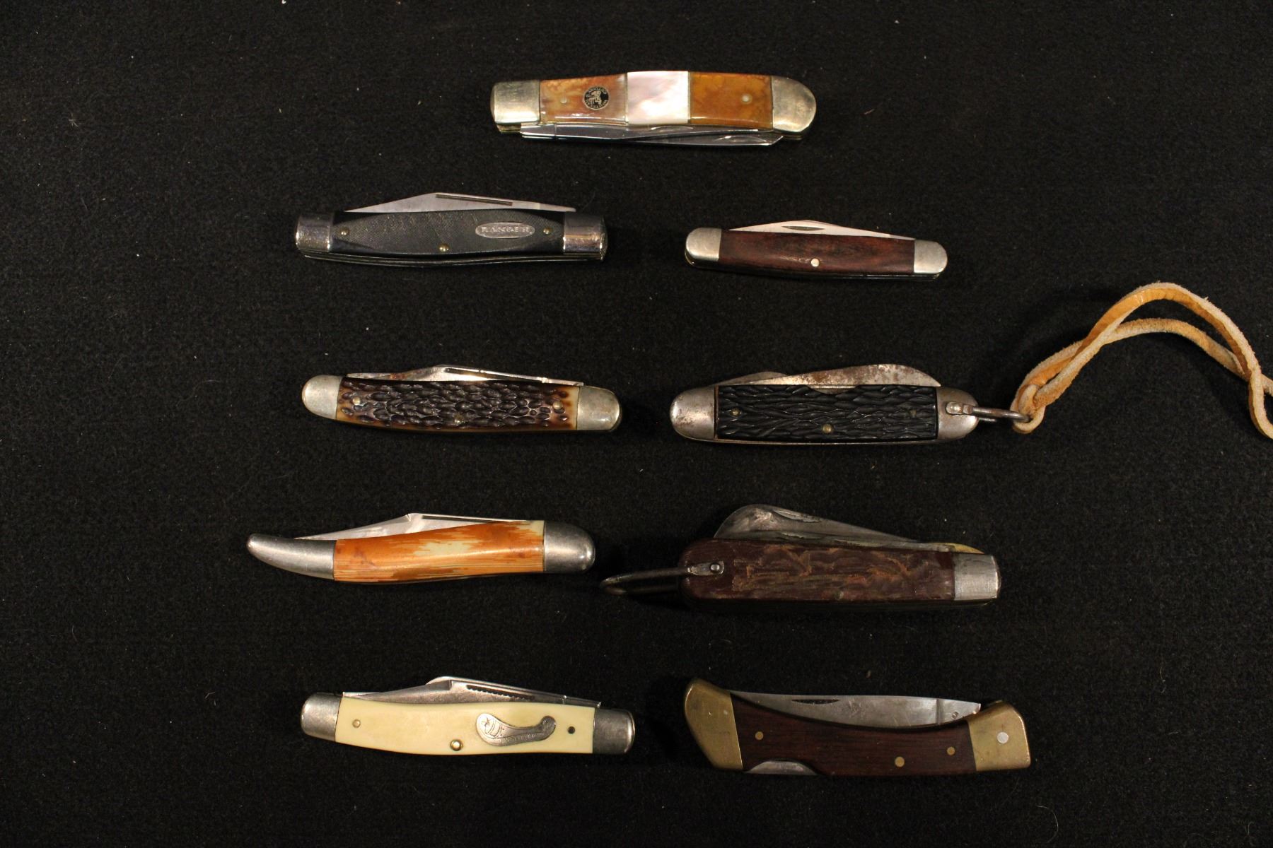 Lot of 9 American pocket knives: Frontier 4432 Ranger Prov USA Kut Master UTICA NY, Whitetail Cutlery, Frontier 4515 K. Klein & Sons, Camco, Bear MGC and Hammer Brand