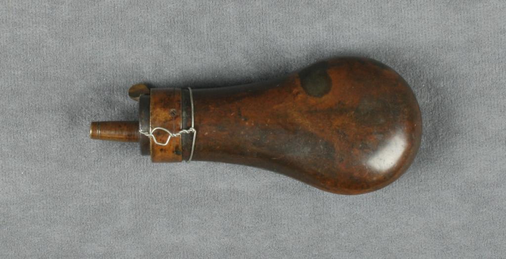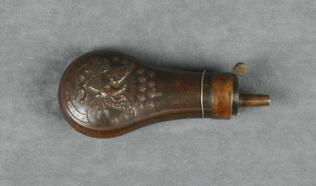 Pocket Model sized embossed brass spread eagle powder flask with charger in overall very good uncleaned condition, dark patina and several old dents. Est.: $150-$250.