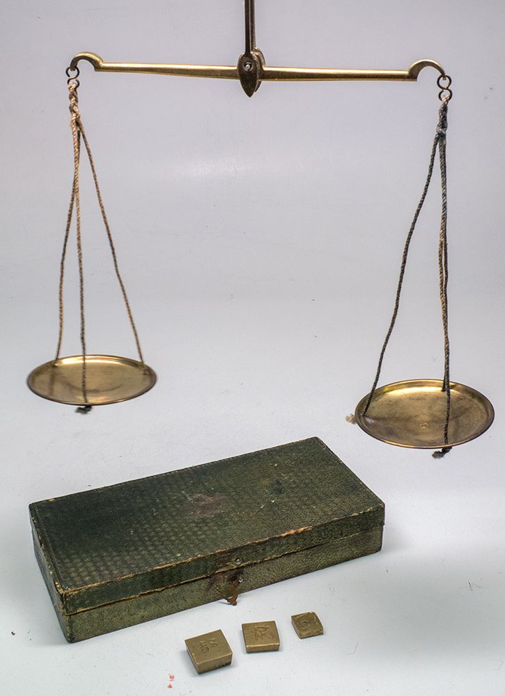 c1880 American made pocket scale (balance) in its original green box. It has an embossed eagle on the top of the box. There is no maker’s mark. The box measures 6.5” x 3.” - HKA#66200