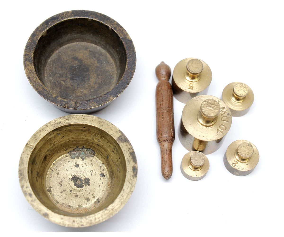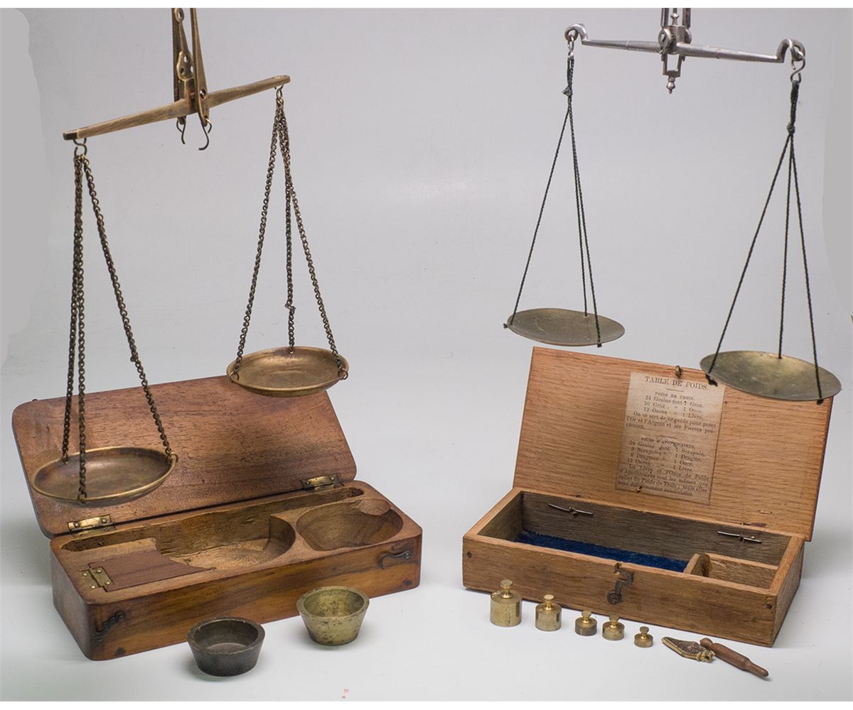 c1850 Lot of 2 pocket scales (balance) in wood boxes. Both contain some weights. One has the original paper label in French. There is no maker’s mark on the pieces. Both boxes measure about 3” x 6” and have some wear. - HKA#66224
