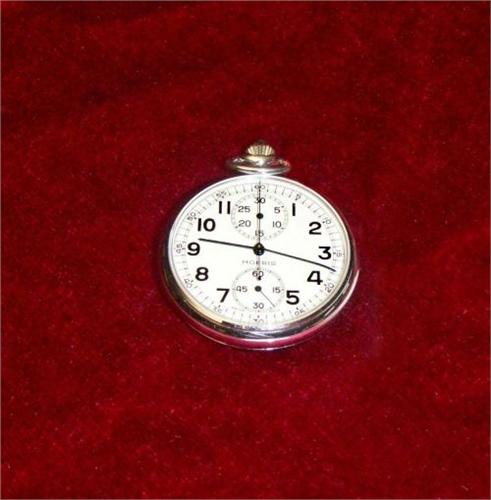 Montre de poche chronographe MOERIS en métal chromé, cadran à chiffres arabes, cadran compteur 30 minutes à 12 heures et cadran petite seconde à 6 heures. Les 3 fonctions du chronographe se font par le poussoir au pendant. Dans le mouvement se trouve un compartiment pour les pièces de rechange, en très bon état, env. 1950