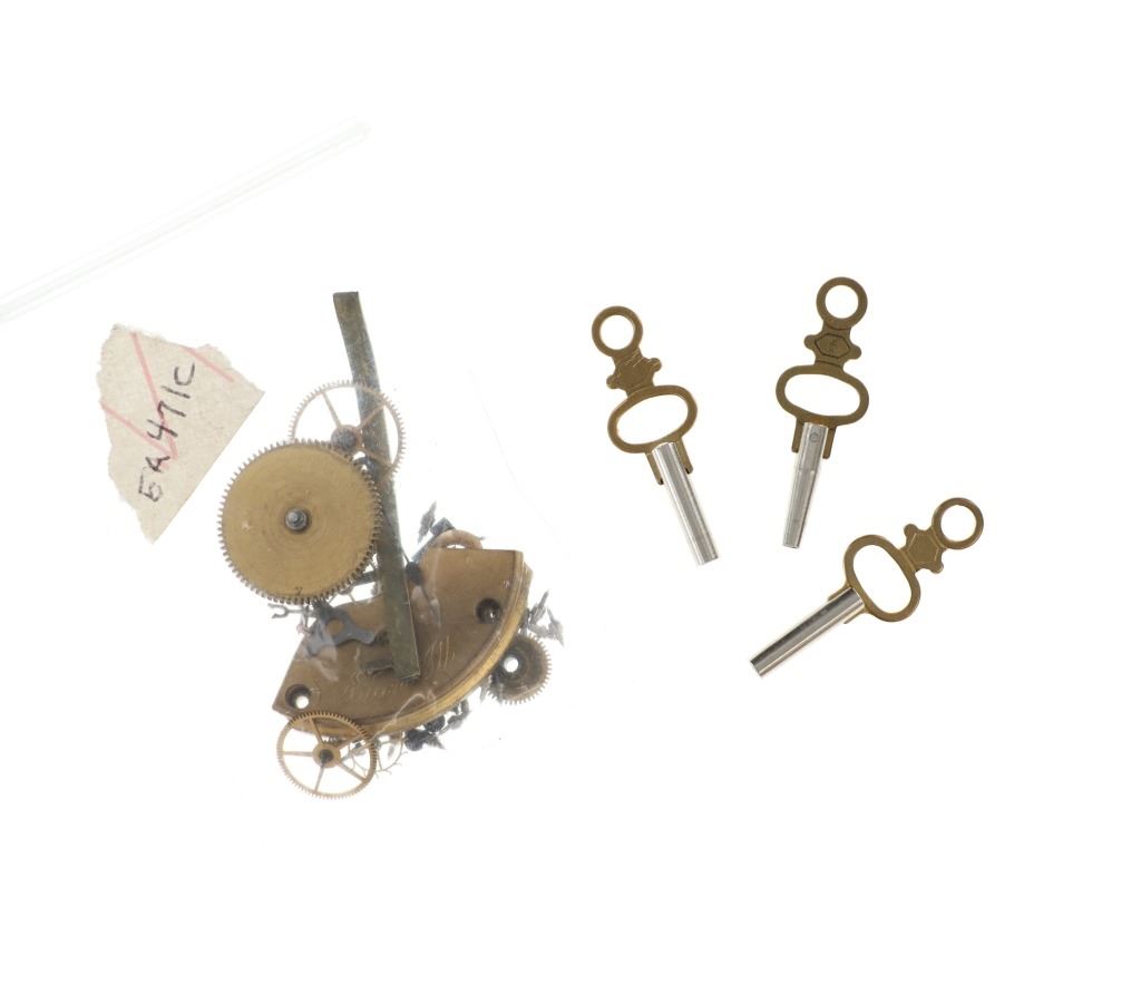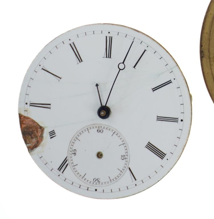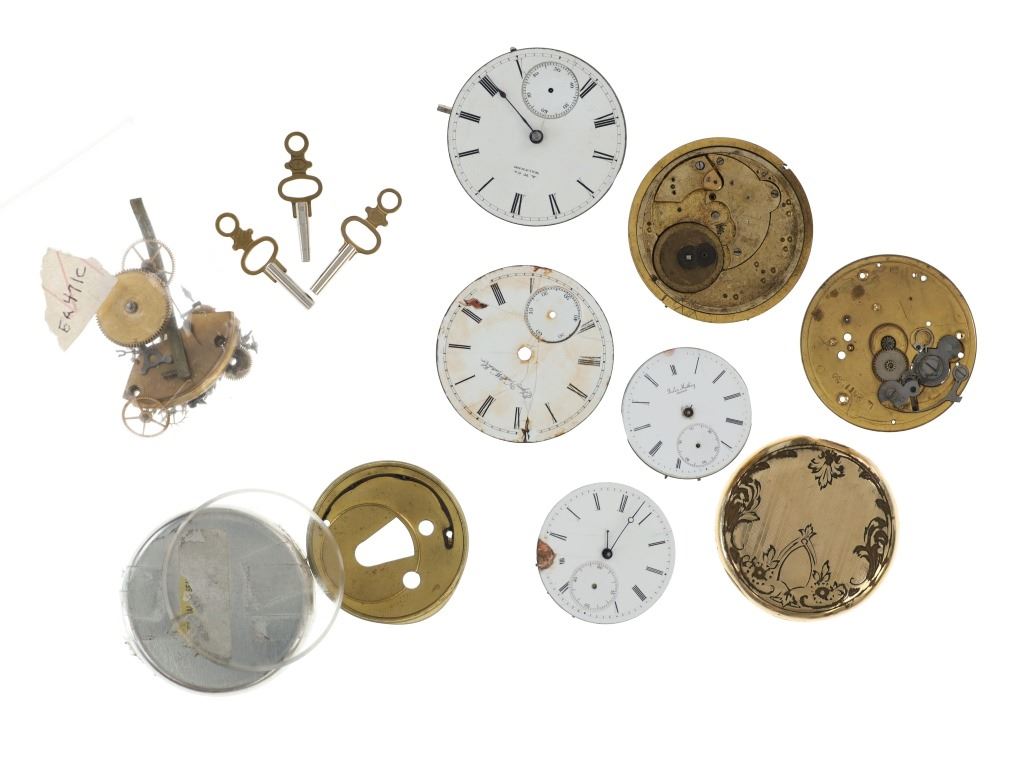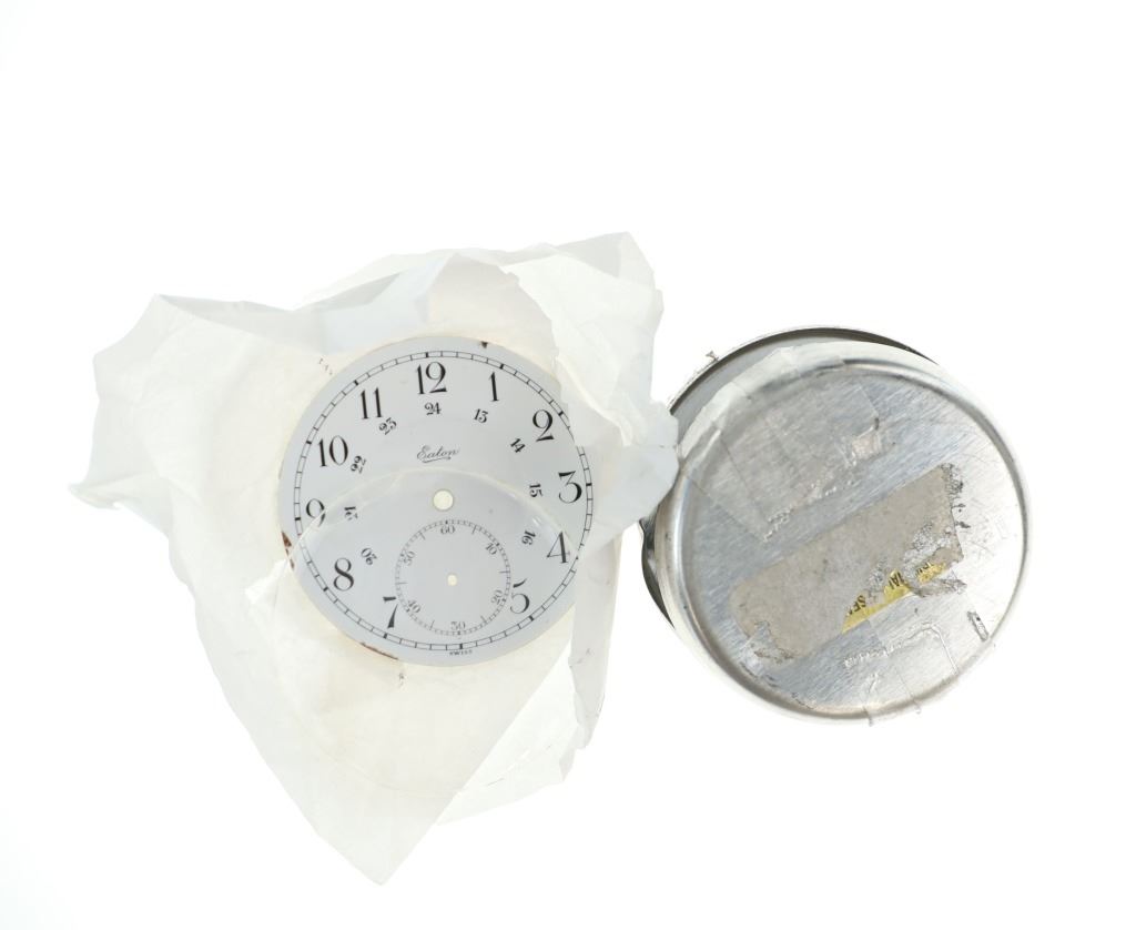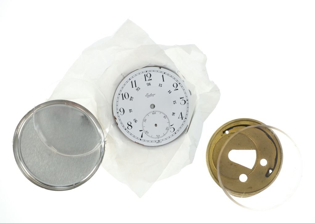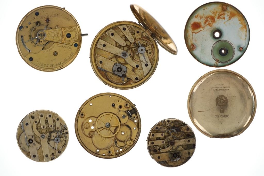Featured in this lot is this pocket watch glass, case backing, and mechanism collection. The collection includes numerous mechanisms and watch faces a brass case backing and two watch face glasses. The condition of this collection of is fair with some of the hands from the mechanisms missing but otherwise shows fair overall condition. The measurements of the box the parts are in is 2 1/4" x 8 3/8" x 4 3/4".