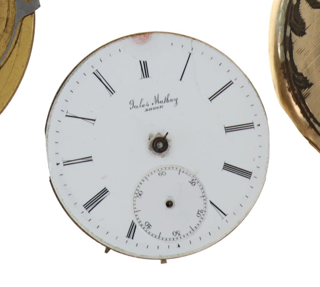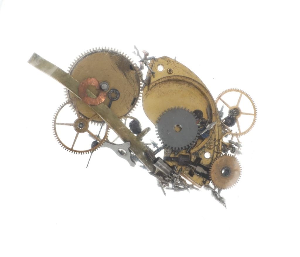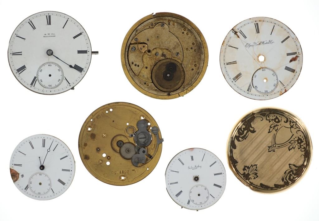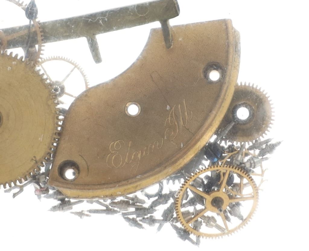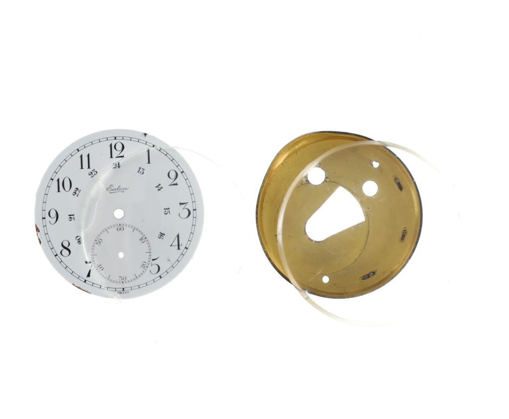 Featured in this lot is this pocket watch glass, case backing, and mechanism collection. The collection includes numerous mechanisms and watch faces a brass case backing and two watch face glasses. The condition of this collection of is fair with some of the hands from the mechanisms missing but otherwise shows fair overall condition. The measurements of the box the parts are in is 2 1/4" x 8 3/8" x 4 3/4".