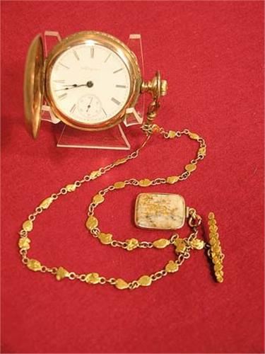 Gold pocket watch - Elgin engraved floral design, G.E.P. monogram, gold nugget chain with gold quartz fob.