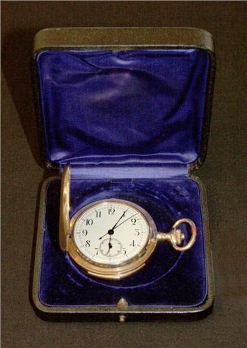 Très belle montre de poche savonnette en or 14 cts, signée MOULINET NO 224111, répétition minutes et chronographe, cadran en émail blanc, seconde centrale et petite seconde à 6 heures, mouvement blanc, balancier bimétallique, en parfait état. Armage de la répétition sur timbre, ressort par verrou et poussoir du chronographe sur la carrure, vers 1910