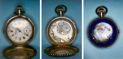 Montre savonnette en argent émaillée, répétition heures et quarts avec chronographe, cadran signé J.ULLMANN & CIE, LA CHAUX-DE-FONDS, fond et lunette sertis de demi-perles, Ø 53 mm, époque 1890