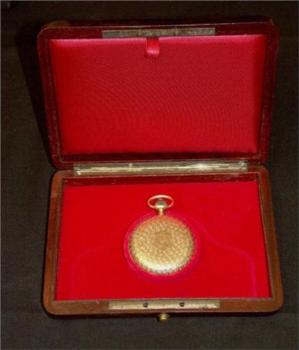 Très belle montre de poche savonnette en or 14 cts guilloché, cadran en émail blanc avec chiffres romains pour les heures et arabes pour les minutes, signée QUALITE NARDIN, échappement à ancre ligne droite, spiral Breguet 16 rubis et chatons, balancier compensé No 25391, env. 1900, avec coffret