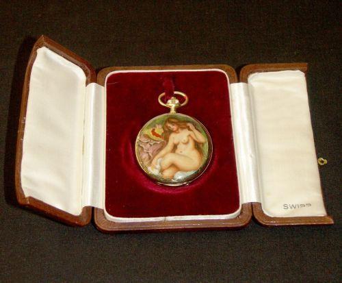 Très jolie montre de poche savonnette en or l8 cts. Sur le couvercle est représenté une femme nue en émail et au dos, des fleurs gravées et émaillées, cadran blanc à chiffres romains, signée PIC DE LA MIRANDOLE, avec coffret, env. 1960