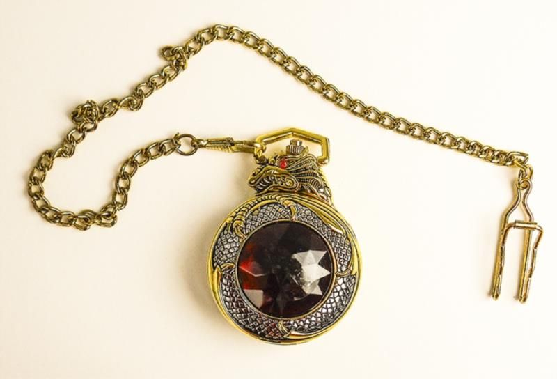 Gold Gilded Pocket Watch With Quartz Movement. Case Is Decorated With Three-dimensional Ancient Chinese Dragon Pattern And Enhanced With A Brilliant Ruby Like Stone. Watch Hangs From A Gold Chain Which Is Included.