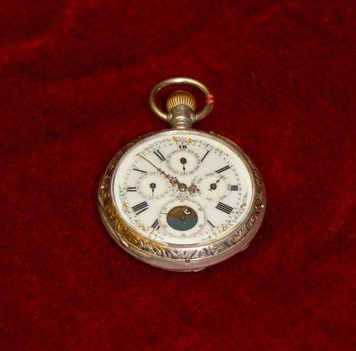 Montre de poche en argent 800 avec triple quantième et lune, cadran en émail blanc entouré de guirlandes de fleurs à chiffres romains, échappement ancre, en bon état, env. 1890