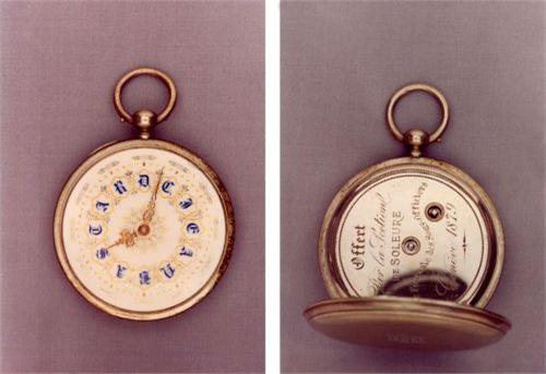 Montre de poche en argent, avec inscription dans la cuvette «Offert par la section de Soleure, Fête fédérale des Sous-officiers Genève 1879», cadran en émail blanc, signée en lettres gothiques bleues C. JEAN BASTARD, avec une chaîne en argent et émail à motif floral