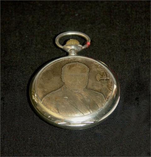 Montre de poche en nickel, signée sur le cadran ROEMER et comporte au dos de la boîte le portrait de MUSSOLINI, env. 1940
