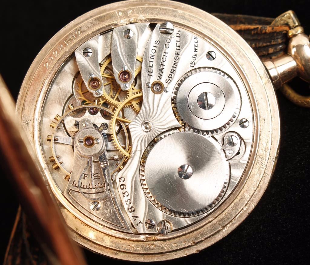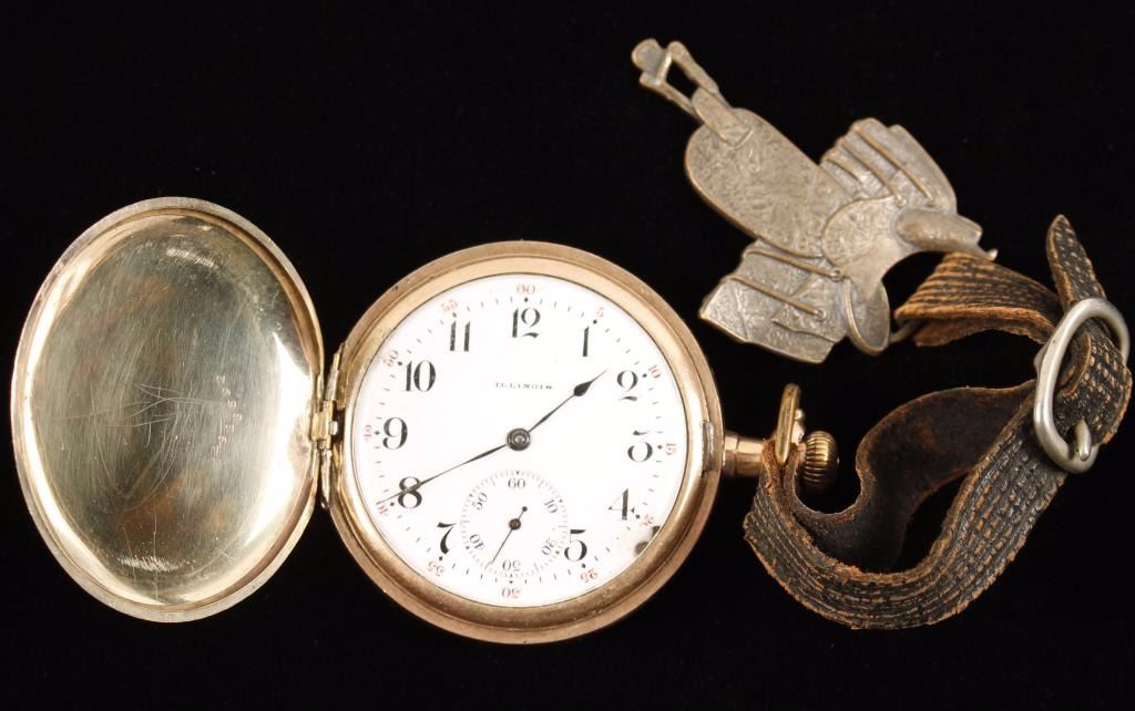 Illinois Watch Co. 15 jewel. Gold tone embossed case with face that shows hours and a second smaller face for seconds. A black leather strap with a buckle connects the metal saddle fob to the watch. Back of saddle reads "We Want Your Business, Tenison Bros. Saddlery Co., Dallas Texas, Robbins Co, Attleboro Mass." Front of watch will not stay closed.