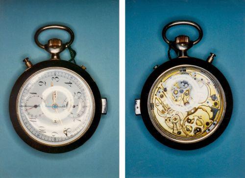 Montre de poche à répétition heures, quarts et minutes, chronographe, triple quantième et lunaison, mouvement dans contour avec fond visible, échappement à ancre suisse, 17 rubis, mouvement Le Phare, env. 1920