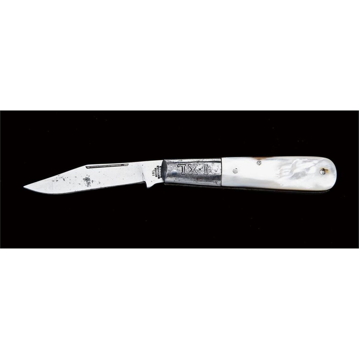 Pocket knife by George Wostenholm (IXL). Approx. 3-3/8” overall (closed) with a 2-3/4” single clip blade of Barlow pattern. Marked “IXL George Wostenholm Sheffield England” The blade is unsharpened with small patches ofdiscoloration. The iron bolsters are marked “IXL” with mother of pearl scales. Iron pins with iron liners. From the Hugh Hayes Collection. Est: $150 - $300