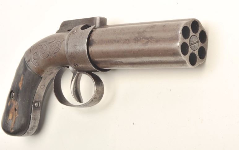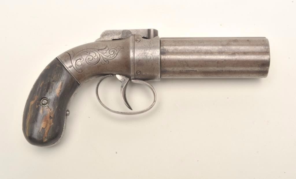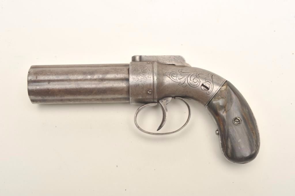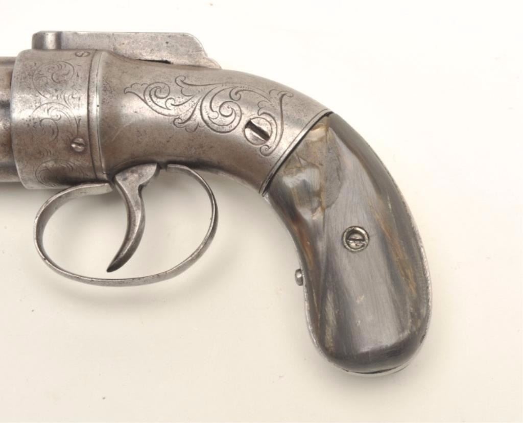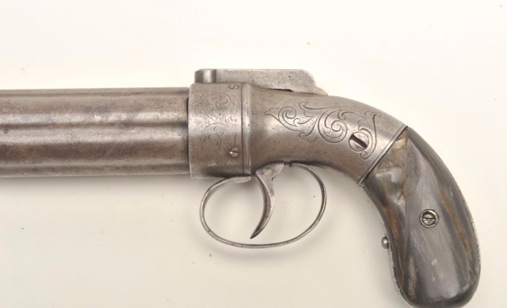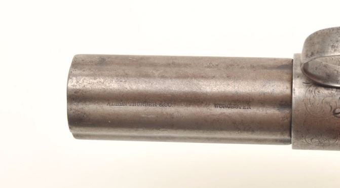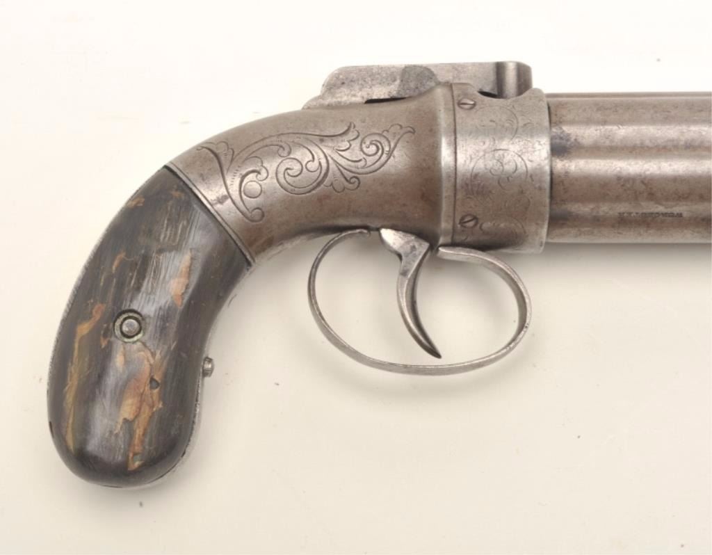 Pocket size Allen Thurber & Co. percussion bar hammer 6-shot pepperbox pistol with engraved nipple shield and horn grips, .32 caliber, 3.25” barrels, grey patina to metal surfaces; in overall good condition with agood action, even patina and what appear to be old replacement horn grips. (Antique). Est.: $200-$400.