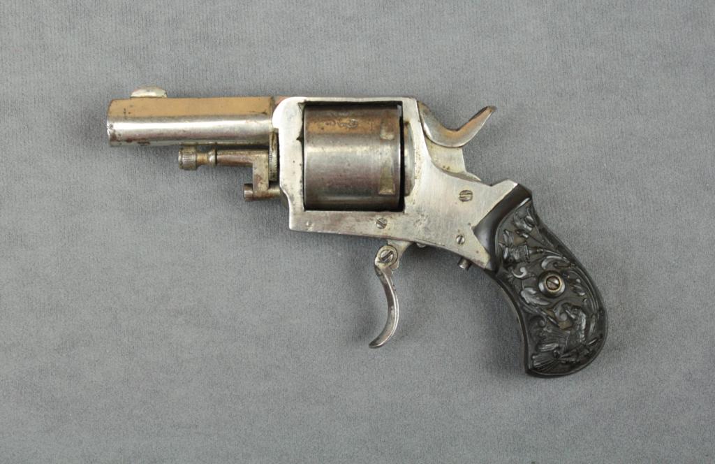 Pocket-sized folding trigger revolver, .30 cal., 2-1/4” barrel, nickel finish, black fancy gutta percha grips with patriotic American Eagle and floral designing, #1476. This gun is in overall fair to good condition showing approx. 65% original finish, some scattered wear and areas of erosion, dark bore, action needs repair; grips are overall very good with just a slight old loss at the top right grip, with a relief spread eagle on both sides. Est.: $150-$300.