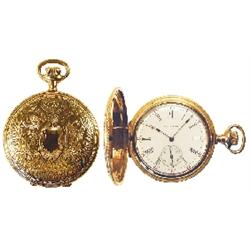Pocket watch, American Waltham Co., 6 size, 15 jewels, hunting case, #11761805, nicely engraved front & back gold case, original paper inside shows sold 12/18/09 in Bessemer, MI, stem wind & set, runs good.