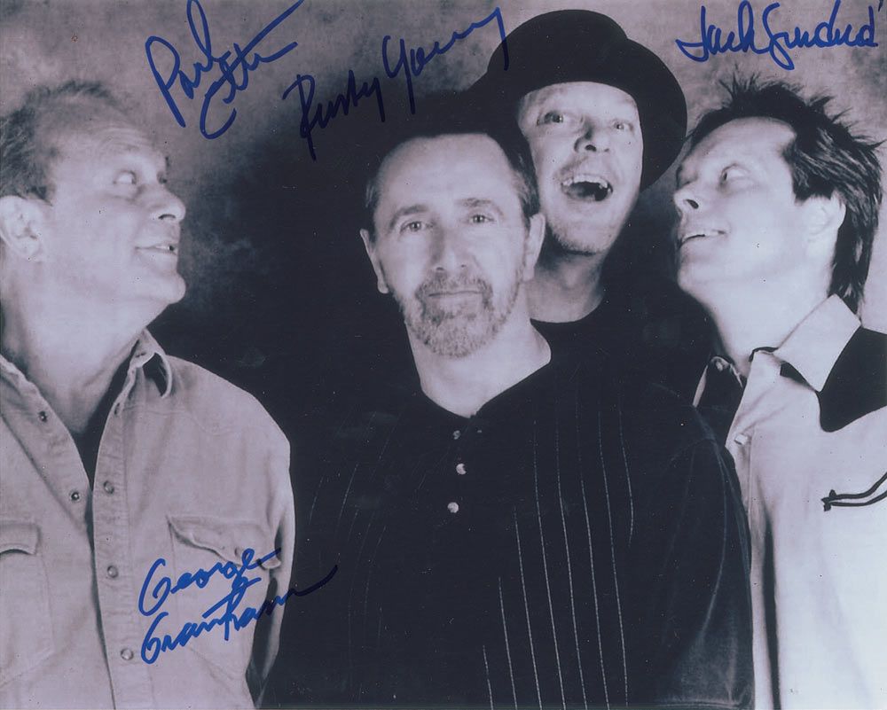Glossy 10 x 8 group photo, signed in blue felt tip by Rusty Young, Paul Cotton, George Grantham, and Jack Sundred. In very fine condition.