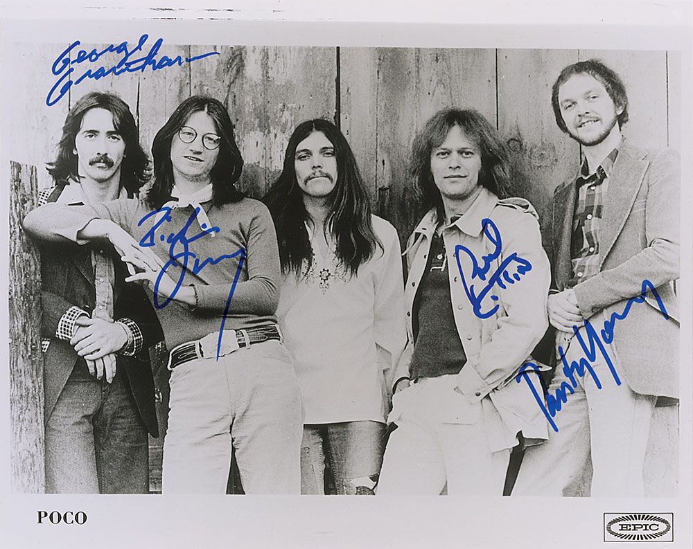 Glossy 10 x 8 group photo, signed in blue felt tip by Rusty Young, Paul Cotton, George Grantham, and Jack Sundred. In very fine condition.