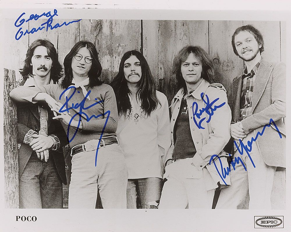 Glossy 10 x 8 Epic Records publicity photo of the band, signed in blue felt tip by Rusty Young, Paul Cotton, George Grantham, and Jack Sundred. In very fine condition.