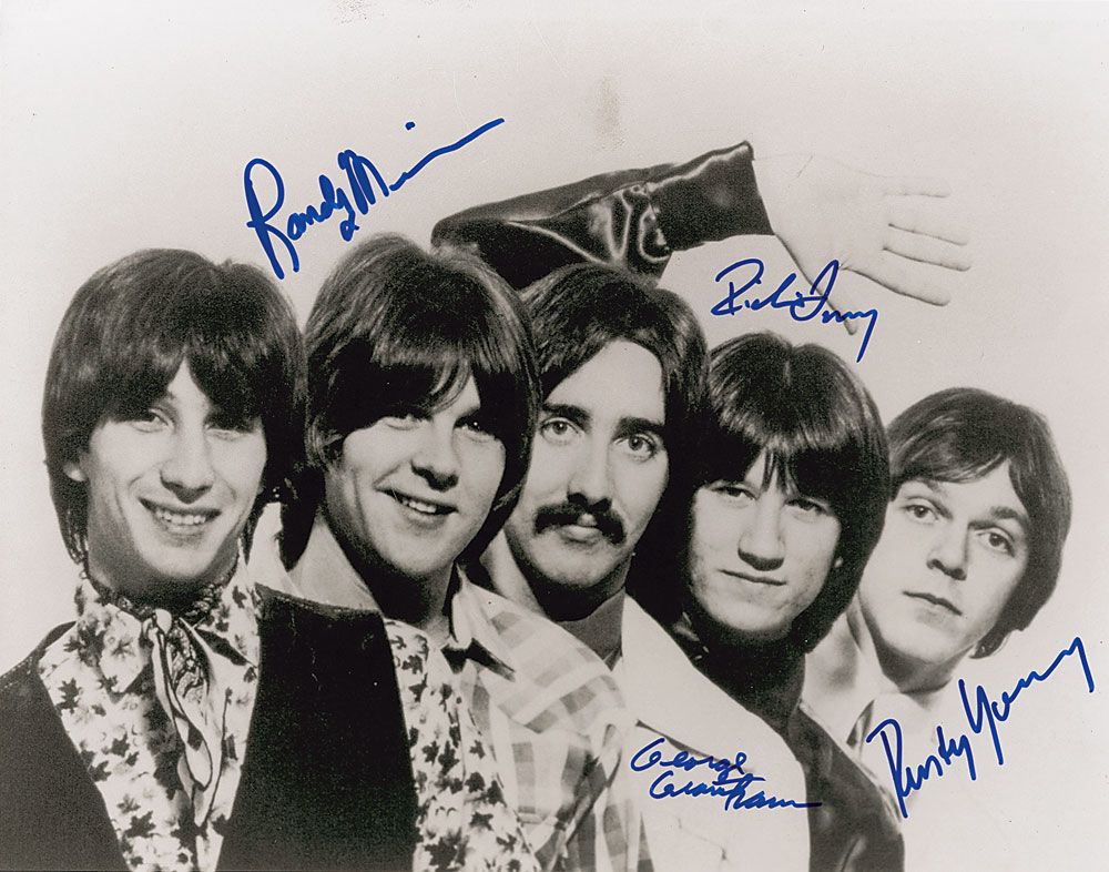 Glossy 14 x 11 photo, signed in blue felt tip by Randy Meisner, Richie Furay, Rusty Young, and George Grantham. In fine condition, with a few scattered light creases and surface dings.
