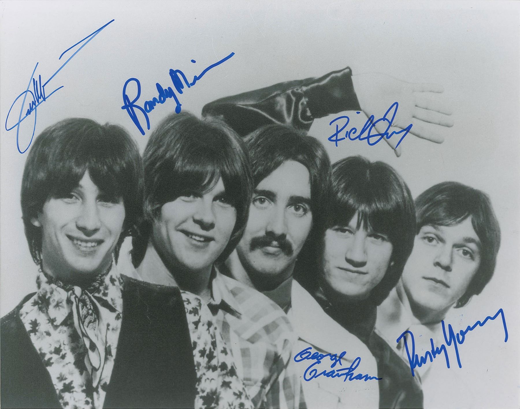 Glossy 14 x 11 photo of the original Poco lineup, signed in blue felt tip by Richie Furay, Jim Messina, Rusty Young, Randy Meisner, and George Grantham. In fine condition.