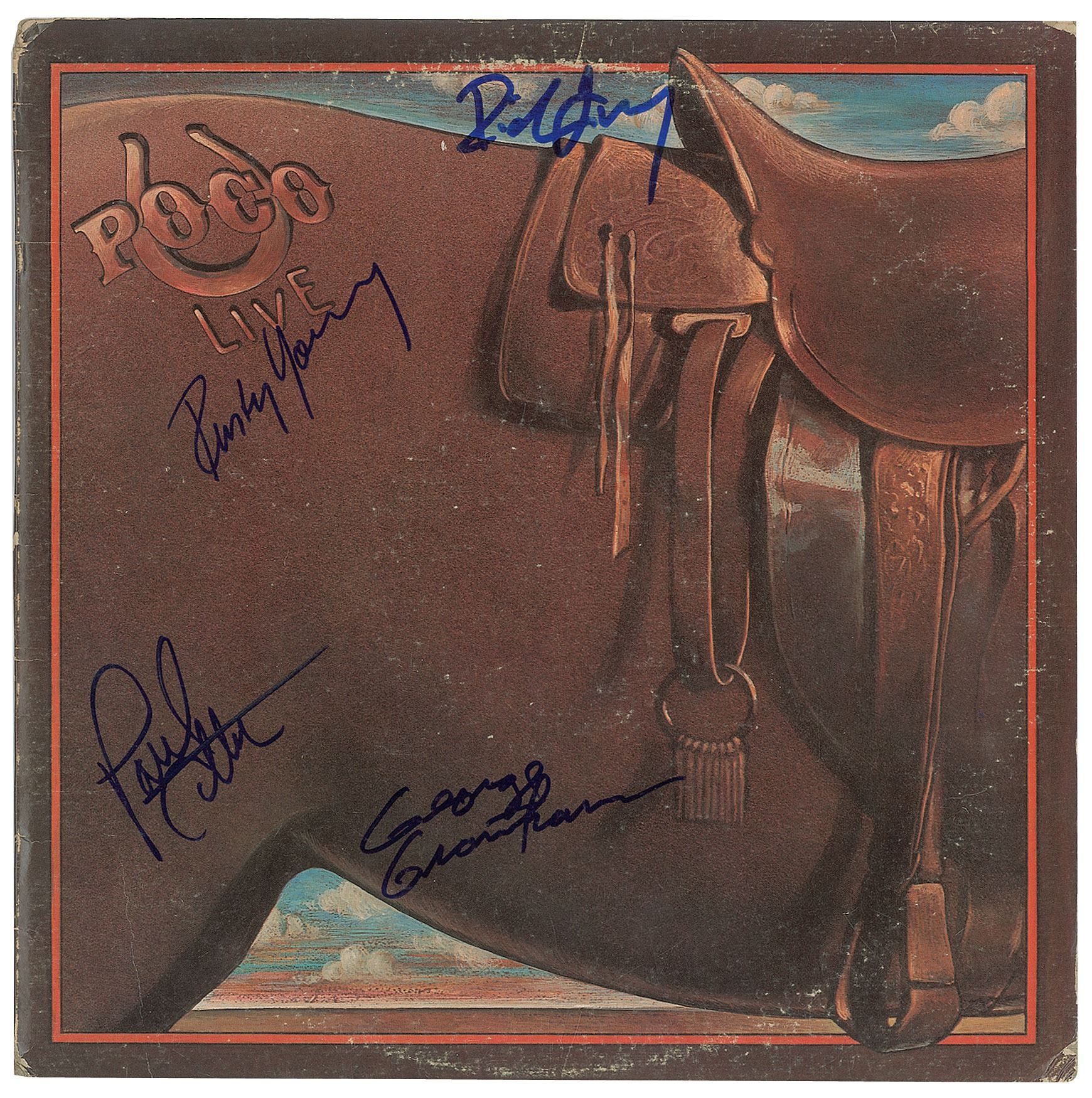Poco Live album signed on the front cover in blue felt tip by Richie Furay, Paul Cotton, Rusty Young, and George Grantham. In fine condition, with light scuffing. The record is not included.