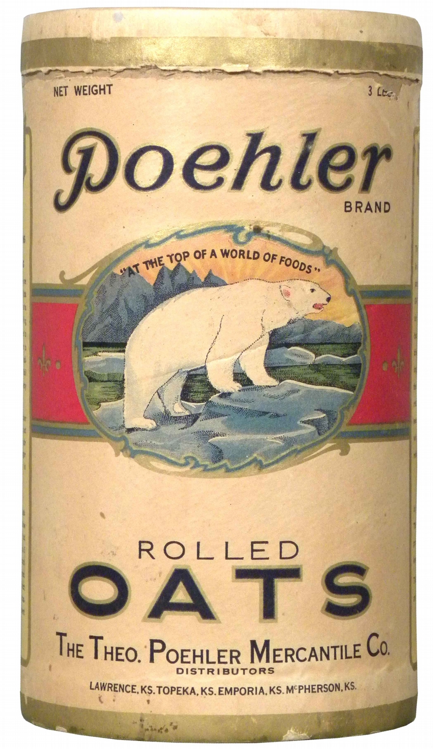 Poehler Brand Rolled Oats 3 lb Box. The Theo. Poehler Mercantile Co. Dist. Kansas. Hole in box at top on back otherwise excellent condition. 9 1/2 inches tall.