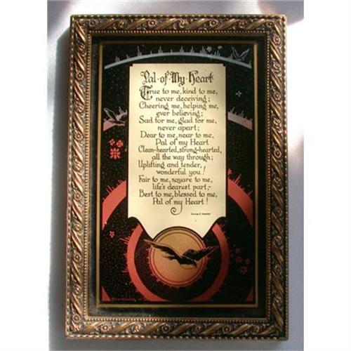 C & A Richards of Boston is known for their beautiful frames. In this little poem picture the floral & ribbon design is lovely. The poem is by Emma E. Koehler titled "Pal O My Heart". The label on the back includes the date "1930". The frame is 4" by 6" and the picture inside is 3 1/4" by 5 1/4".