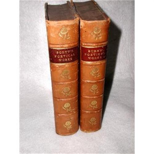 Pair of C.1904 complete poetical works of Robert Burns, "Burns' Poetical Works" and Sir Walter Scott,"Scott's Poetical Works" in matching camel leather spines and corners with marbleized front,back and page edges. Gold lettering and rose embossed design on spine. A photo of each poet in his book. Burn's published in Edinburgh by W.P. Nimmo,Hay & Mitchell,1904. Scott's by Frederick Warne & Co. London. Inscription in the front of each book as a Christmas gift,1905. Slight scuffing to the exterior,otherwise,excellent condition. Measure 7.75H X 1.5D X 5.75L each.
