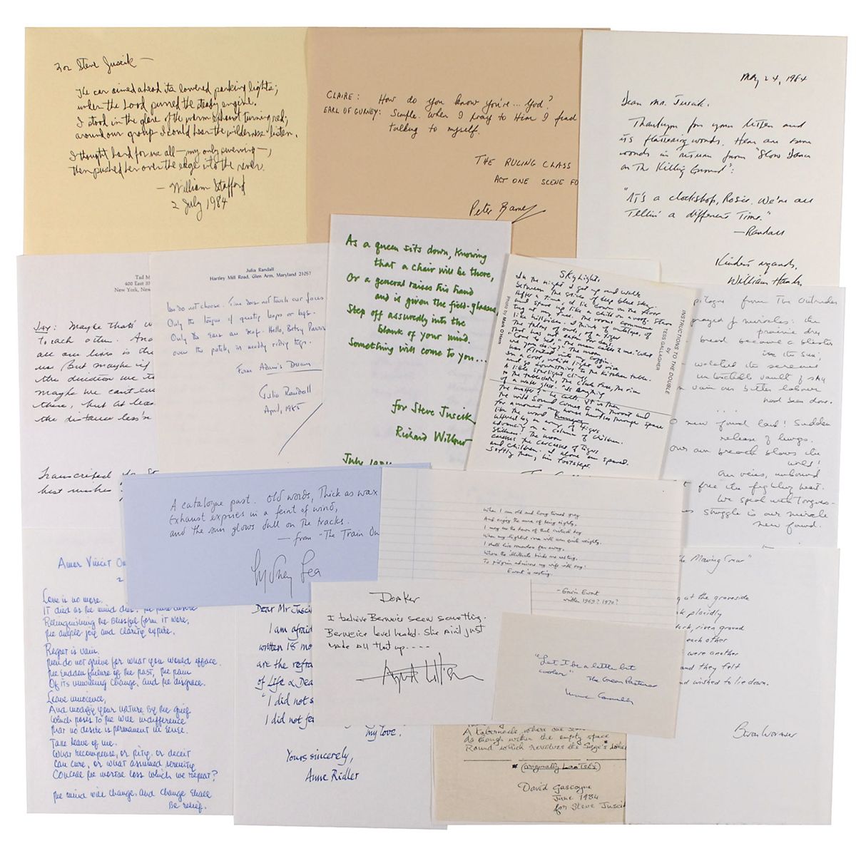 Great collection of 18 AQSs from a variety of poets and playwrights on sheets of various sizes. Signers are: Peter Barnes, Edgar Bowers, Marc Connelly, Alfred Corn, Gavin Ewart, Tess Gallagher, David Gascoyne, William Hanley, Sydney Lea, Dorothy Livesay, Tad Mosel, Molly Peacock, Julia Randall, Anne Ridler, William Stafford, Richard Wilbur, August Wilson, and Baron Wormser. In overall fine condition.