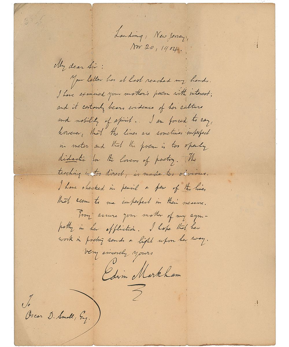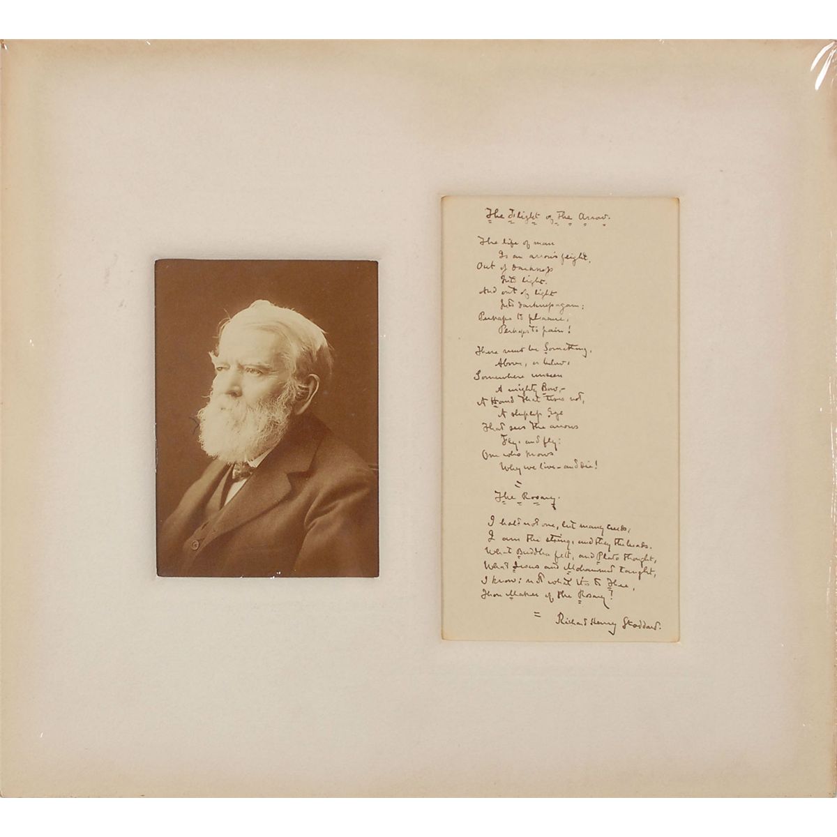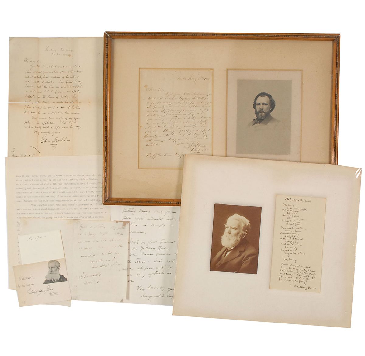Collection of eight items, each signed by a different poet, including: Elizabeth Benger (ALS), Margaret Deland (TLS), Edwin Markham (ALS), Edwin Arlington Robinson (signature), Margaret Sangster (ALS), John Godfrey Saxe (ALS), Edmund Clarence Stedman (signature), and Richard Henry Stoddard (autograph poem). The Saxe is matted and framed with an engraving to an overall size of 18.5 x 15, and the Stoddard is matted with a photo to an overall size of 14 x 12.5. In overall very good to fine condition.