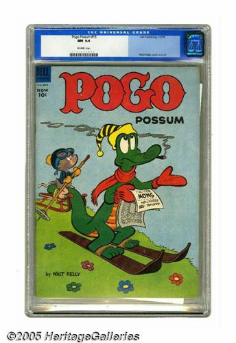 <B>Pogo Possum #15 (Dell, 1954) CGC NM 9.4 Off-white pages.</B></I> More hilarity featuring the denizens of Okefenokee Swamp, drawn by Walt Kelly in classic form. This peerless copy sits alone at the top of CGC's census listing for issue #15 as the highest-graded copy yet certified. Overstreet 2005 NM- 9.2 value = $260. CGC census 6/05: 1 in 9.4, none higher.