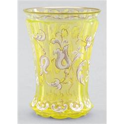 cseh, 19. sz. közepe, csiszolt uránzöld üveg, arany és zománcfestett díszítéssel, m: 12,5 cm