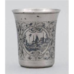 Moszkva, 1862, ezüst, "AR" ismeretlen cirillbetus mesterjegy, niellós díszítéssel, két medalionban városkép, 88,4 g; m: 8 cm