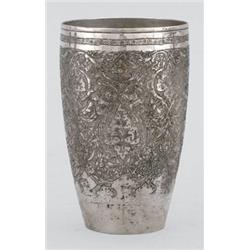 20. sz. elso fele, ezüst, ismeretlen török vagy arab jegyekkel, palástból forrasztott, cizellált medállal, virágmintás díszítéssel, 187,3 g; m: 11,5 cm