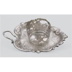 Bécs, 1852, antik ezüst, Vincenz Blasowitz, áttört szolofürtös pohártartó levél alakú tálkán, üvegbetét hiányzik, 248,8 g; m: 19 cm