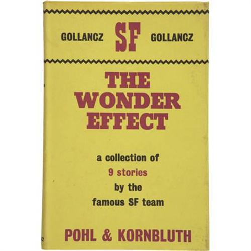 <B>Frederik Pohl and C. M. Kornbluth. </B></I><B><I>The Wonder Effect</B></I></B></I><B>.</B></I> London: Victor Gollancz, 1967. <BR>First English edition with publisher's review slip laid-in. Inscribed by Frederick Pohl on the title page. Octavo. 159 pages.<BR><BR>Publisher's red boards with titles in gilt on the spine. Boards slightly warped. Small stain on front board at the corner edge. A foxing spots on the endpapers and pastedown. Rear free endpaper creased. Contents sound. Dust jacket slightly toned on the spine panel with slight shelf wear. Very good. <I>From the Robert and Diane Yaspan Collection.</B></I><BR><BR><b>Shipping:</b> Books & Catalogs (<a target="_blank" href="http://www.heritageauctions.com/common/shipping.php">view shipping information</a>)