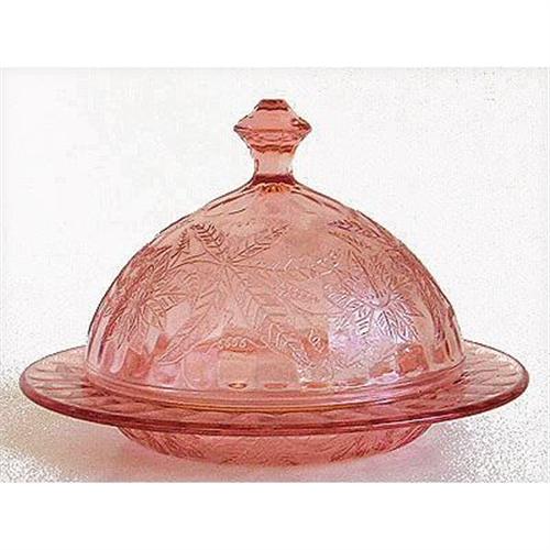 <tr><td>Title:Poinsettia Pink Depression Glass Butter Dish</td></tr>