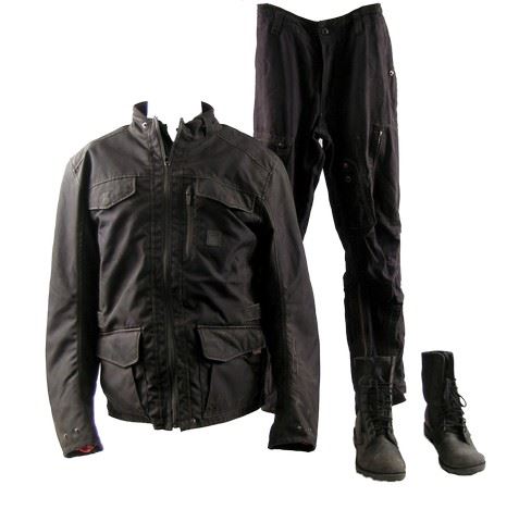 Grommet (Matias Varela) screen worn, hero, worn for production, black long sleeve zipper front with front pockets 'LS2 Apparel' motorcycle jacket with shoulder padding, (size L) black multiple zipper pockets 'Mil-Tec' tactical pants, (size S) and black lace up the front tactical boots. (size 11) Includes wardrobe tag.
