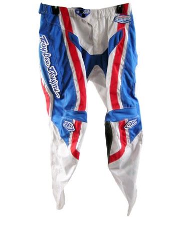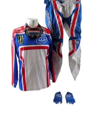 Johnny Utah (Luke Bracey) screen worn, slightly distressed, blue, red, and white 'Troy Lee Designs' long sleeve motorcycle jersey with multiple sponsorship logos on the front and back, (size S) black with clear lens 'EKS Brand' goggles, blue with white design padded racing gloves, and blue, red, and white 'Troy Lee Designs' motorcycle pants. (size 32)