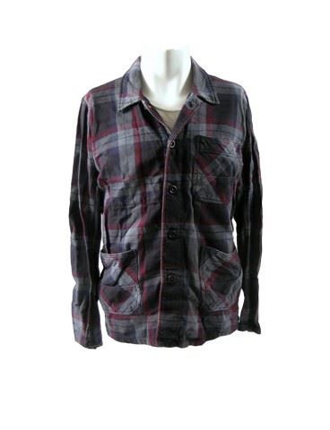 Johnny Utah (Luke Bracey) screen worn, hero, dark blue, green, and red long sleeve button front flannel shirt, and light grey sleeveless 'Mere v. Schwanen' shirt. (size 5)