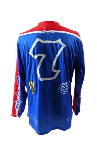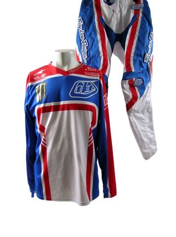Johnny Utah (Luke Bracey) screen worn, blue, red, and white 'Troy Lee Designs' long sleeve motorcycle jersey with multiple sponsorship logos on the front and back, (size L) and blue, red, and white 'Troy Lee Designs' motorcycle pants. (size 34)