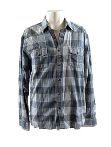 Johnny Utah (Luke Bracey) screen worn, blue, white, and light blue plaid long sleeve snap button front 'Lucky Brand' shirt, (size L) and grey short sleeve crew neck 'Lucky Brand' t-shirt.