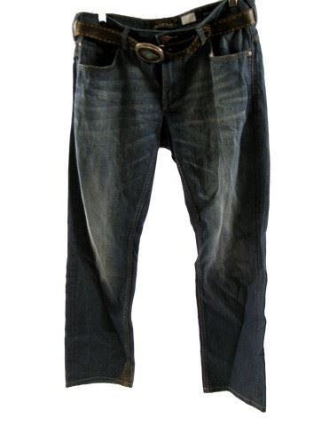 Point Break (2015) - Pappas (Ray Winstone) screen worn, hero, black denim with pockets on the front button up 'Indigofera' vest, (size L) tan thin stripe long sleeve snap button front 'Lee' Western shirt, (size XXL) medium blue denim 'Crafted Goods' jeans, (size 37/34) brown leather with turquoise belt buckle belt, dark brown frame fold up sunglasses, and brown woven leather slip on shoes.
