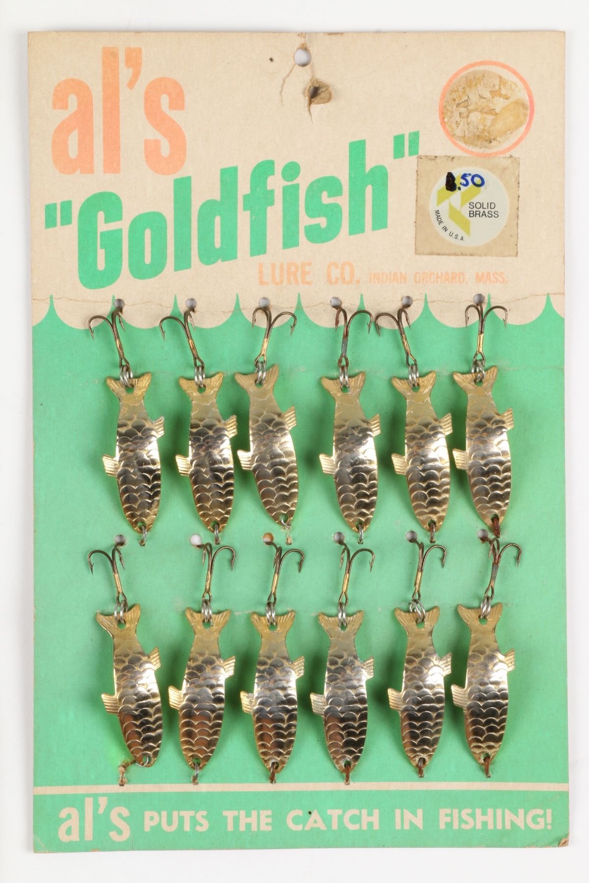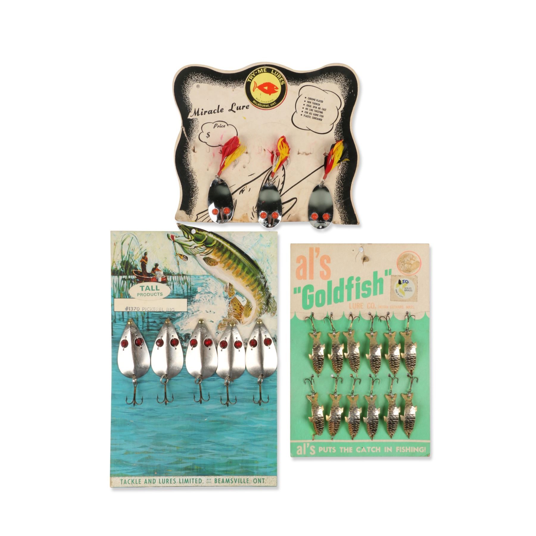 Tackle and Lures Limited, Al's Goldfish, Try-Me Lures, North America. 1960s. Carded. Material: Metal. Quantity: 3. Grade: VG. 2" - 3.5". Est. $75-100.