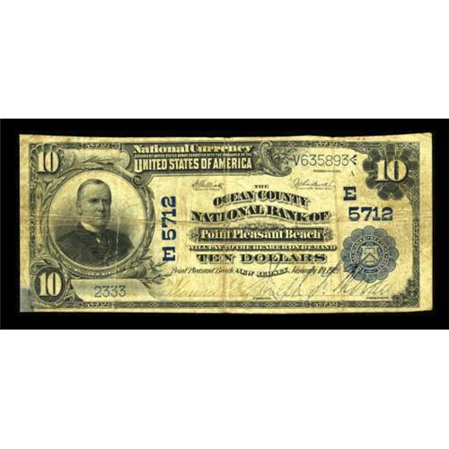 <B>Point Pleasant Beach, NJ</B></I> - $10 1902 Plain Back Fr. 633 <B>The Ocean County NB</B></I> Ch. # (E)5712<BR> <BR>A much in demand area and a scarce bank as well. The note itself grades <B>About Fine,</B></I> but there is a considerable chunk missing from the left corner. Despite the grade, large notes are in short supply from this popular Ocean County location. <BR><BR><b>Shipping:</b> Coins & Currency (<a target="_blank" href="http://www.heritageauctions.com/common/shipping.php">view shipping information</a>)