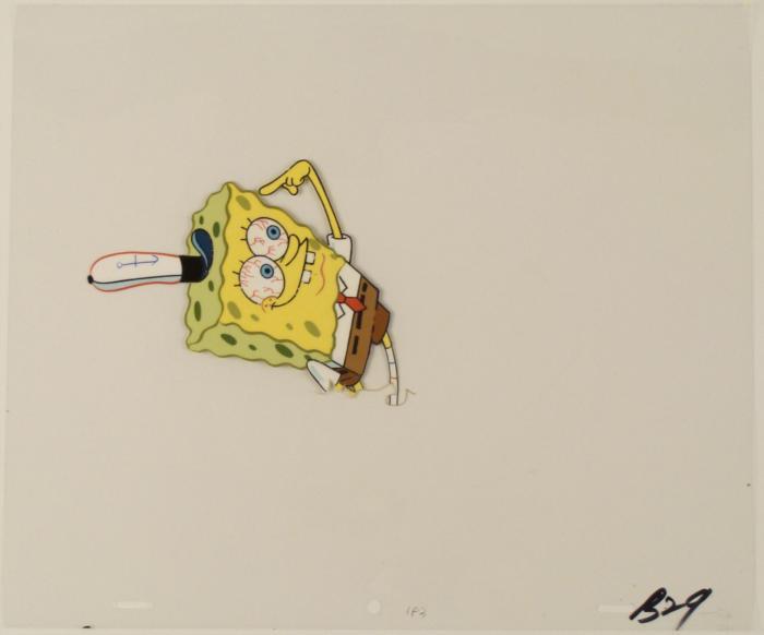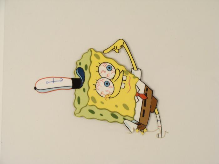 This original animation cel is from the Nickelodeon TV show SpongeBob Squarepants. The story takes place under the deep blue sea in Bikini Bottom, where SpongeBob resides. SpongeBob, who is a yellow, porous sponge, is your typical happy-go-lucky character, as he is always cheerful and enjoys making people laugh. Patrick Star, SpongeBob's neighbor who is a starfish, is your average children's show idiot, as he boasts knowing nothing and is often getting himself into ridiculous situations. Between the homes of these two lies the home of the miserable Squidward, a squid, who is known for being grouchy and playing tricks on SpongeBob and Patrick. Both SpongeBob and Squidward work at the Krusty Krab, a fast food business run by the greedy money-loving Mr. Krabs, a crab, the arch rival of the evil, possibly misunderstood, Plankton. Another neighbor, Sandy Cheeks, an athletic squirrel who normally wears an astronaut's space suit, was introduced in "Tea at the Treedome." She spends most of her time inventing and experimenting. SpongeBob seems to be pointing to his head.Original Production Animated Cel Overall Size of Cel: 10 1/2" x 12 1/2" Very Good ConditionThis is an original hand-painted cel set-up used in the production of an episode of "SpongeBob SquarePants." Each one-of-a-kind set-up represents a slight change in position of the characters. When individually photographed and projected in rapid succession, the images appear to move.